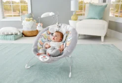 Die Babyschaukel mit der sanften Wippbewegung beruhigt das Baby. Die zwei Tierfreunde am abnehmbaren Spielbügel animieren das Baby zum Anstupsen und Greifen, perfekt für die Förderung der Motorik