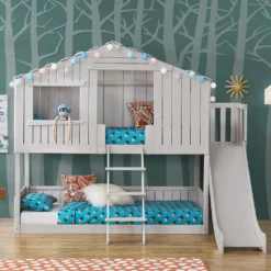 FURNIX Etagenbett In Hausform DERSI 80×160 Mit Schublade Und Matratzen Weiß-Grau