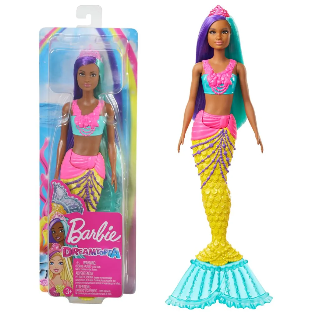 Die Barbie Dreamtopia Meerjungfrau-Puppen glänzen in Regenbogenfarben und inspirieren Kinder zu fantasievollen Geschichten! Diese Barbie Meerjungfrau-Puppe gönnt sich in ihrem bunten Oberteil und ihrer schimmernden Schwanzflosse mit magischen Details eine Erfrischung. Das leuchtende Diadem in ihrem langen Haar setzt einen zusätzlichen Farbakzent. Die Schwanzflosse der Barbie-Puppe lässt sich in der Hüfte biegen, sodass Kinder sich ihre ganz eigenen Geschichten ausdenken und diese nachspielen können: im Meer „schwimmen“ oder in der Sonne relaxen. Mit den Barbie Meerjungfrau-Puppen ist es ganz leicht, Träume auszuleben, denn Dreamtopia ist eine Welt, in der Träume wahr werden! Hier können Kinder jede Menge Spielspaß erleben. Mit allen Barbie Dreamtopia-Puppen und -Spielzeugen entsteht eine magische Welt, die zum Träumen und Spielen anregt! Alle Artikel separat erhältlich. Die Puppen können nicht von allein stehen oder schwimmen. Abweichungen in Farbe und Gestaltung vorbehalten.