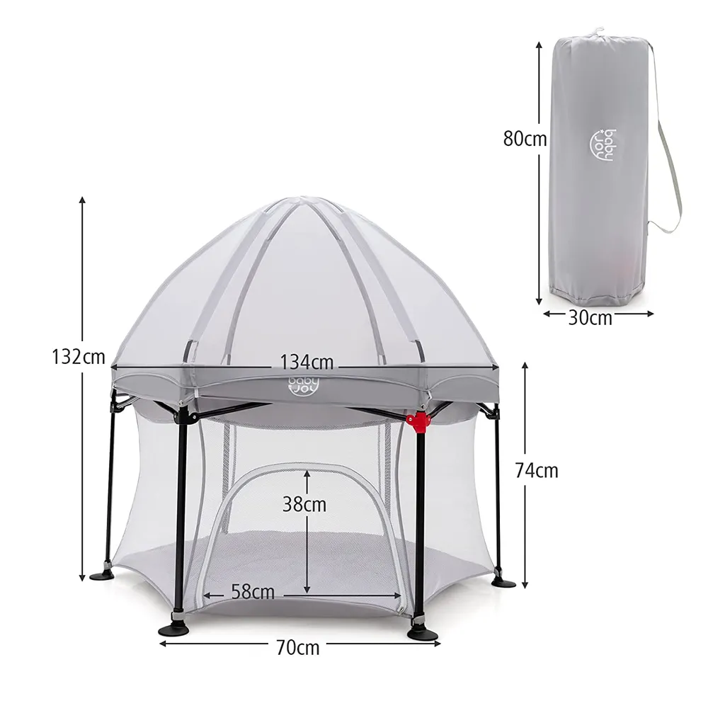 Unser tragbarer Baby-Laufstall wurde speziell für Ihre lieben Kinder entwickelt. Mit den Maßen 134 cm x 132 cm x 132 cm (L x B x H) bietet der Spielhof ausreichend Platz für Kleinkinder zum Sitzen, Krabbeln, Laufen und Spielen. Er verfügt über ein abnehmbares Verdeck, um Mücken fernzuhalten. Außerdem besteht er aus geruchlosem Oxford-Gewebe für eine sichere Verwendung. Und die umlaufende Netzwand sorgt für gute Belüftung und volle Sicht. Wenn Sie ihn nicht brauchen, können Sie den Klappknopf nach unten drücken, um den Laufstall auf eine kompakte Größe zu falten, die nicht zu viel Platz einnimmt. Darüber hinaus wird er mit einer tragbaren Tasche zum bequemen Tragen des zusammengeklappten Baby-Laufstalls geliefert. Die gepolsterte Matte mit Schwammfüllung bietet Kindern super Komfort. Darüber hinaus sorgen der solide Stahlrahmen und die rutschfesten Fußpolster dafür, dass er stabil und nicht leicht wackelt.