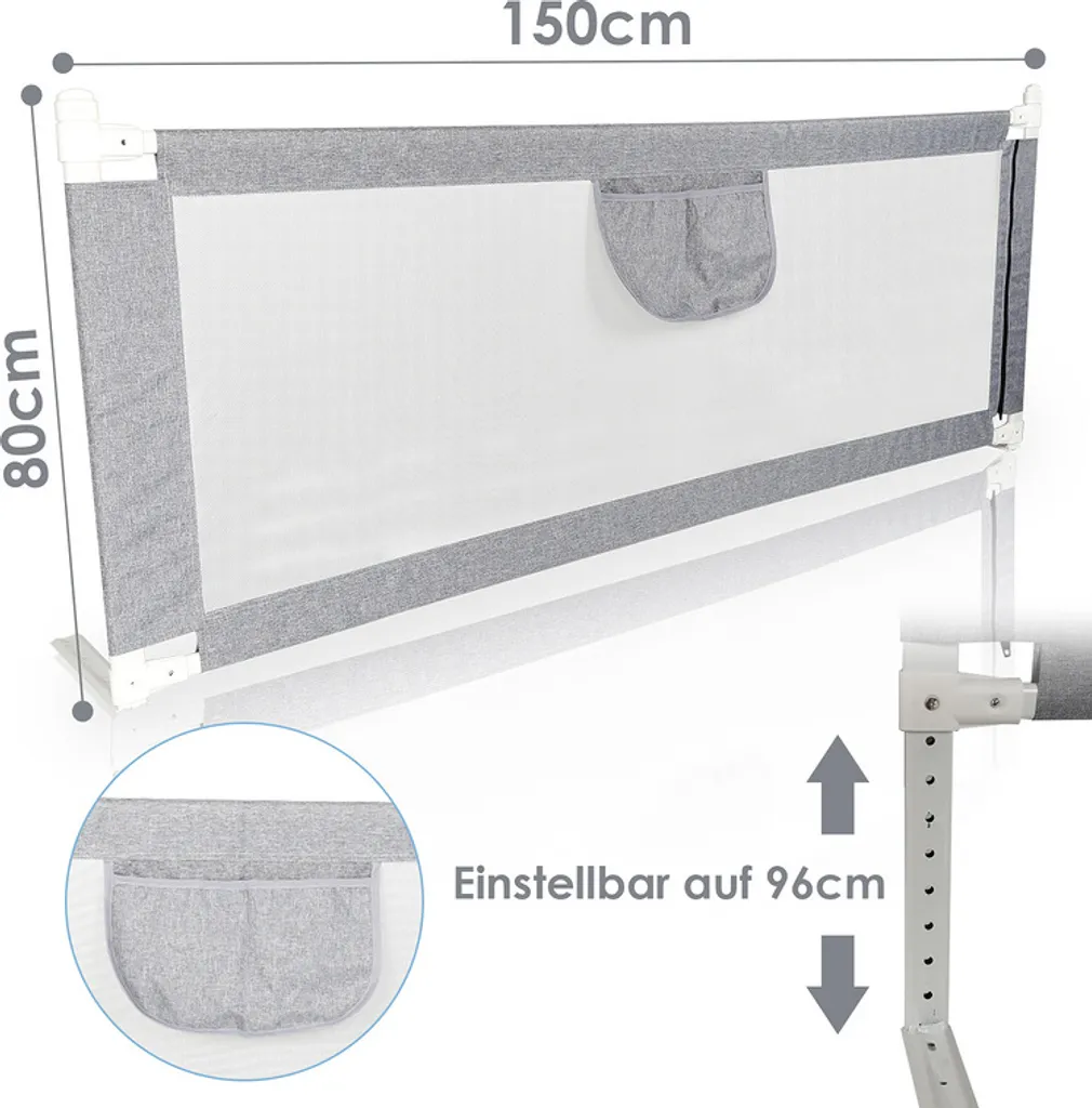 Die Höhe kann von 60 bis 96 cm eingestellt werden. Unsere Bettgitter ist höher als die normale Krippenleitplanke und bietet auch Schutz, wenn das Baby unruhig beim Schlaf ist. Sie ist für die meisten Standardbetten geeignet.