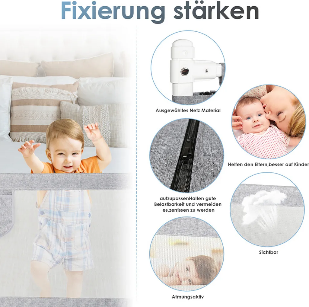 4.Hohe Qualität und Sicherheit: Das Bettgitter besteht aus Leinenstoff + Kohlenstoffstahl. Das atmungsaktive Nylonnetz sicherstellen, dass die Mutter das Baby durch das Netz sehen kann. Das Stahlrohr macht den Rahmen stabiler und langlebiger, die