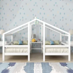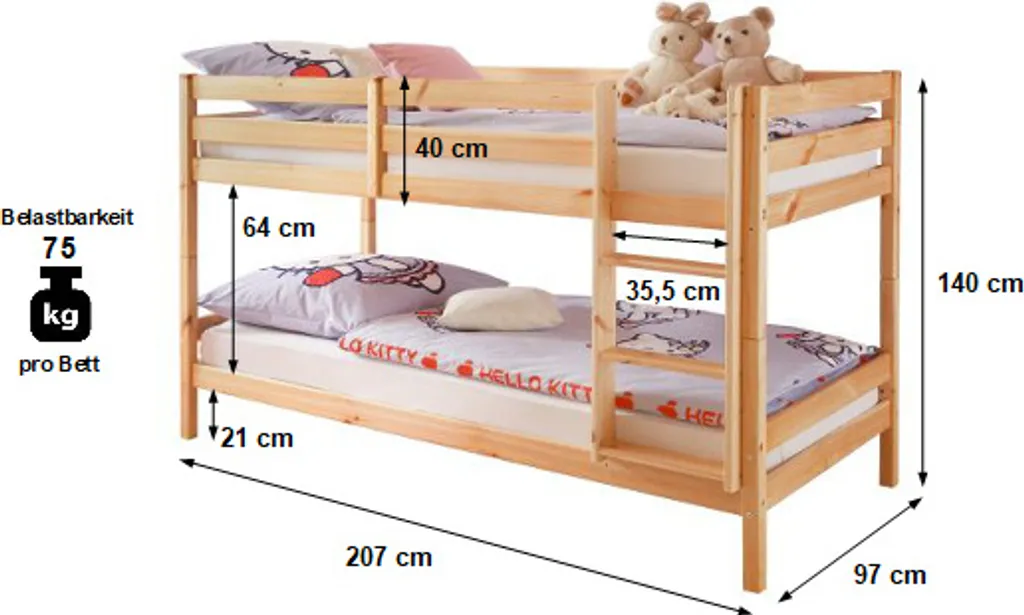 Wenn Sie gerne möchten, dass Ihre Kinder gemeinsam im gleichen Zimmer Aufwachsen sollen, ein 2. Zimmer nicht vorhanden ist, oder die Fläche besser zum Spielen genutzt werden sollte, ist Ihre Entscheidung für dieses Etagenbett genau richtig. Mit diesem Bett werden Sie bei Ihren Kindern mit Sicherheit punkten, denn dieses top moderne und sehr praktische Bett aus massiver Kiefer ist zusätzlich ein aufregender Spielplatz. Das Etagenbett ist geprüft nach Sicherheits-Normen EN 747-1 und 747-2. Und wenn Ihre Kids größer werden und keine Lust mehr auf ein Etagenbett haben, oder jeder ein einzelnes Zimmer bekommt, können Sie mit wenigen Handgriffen aus dem Etagenbett 2 Einzelliegen stellen. Einfach und durchdacht für die wichtigsten Menschen dieser Welt.