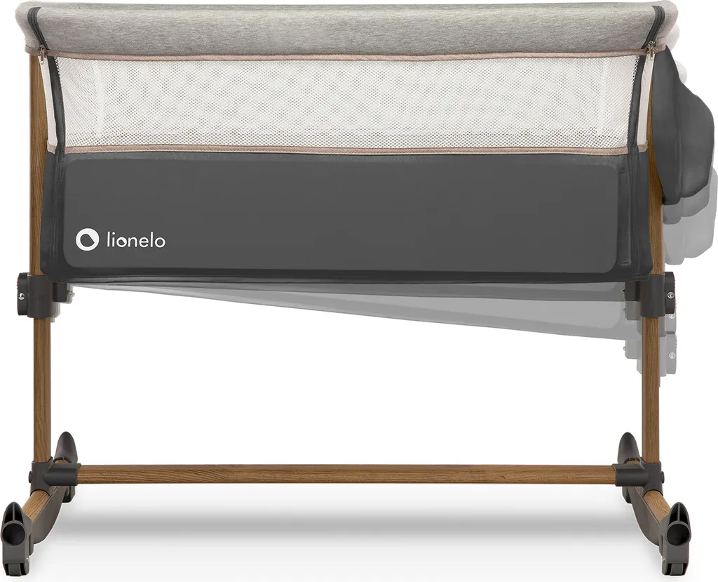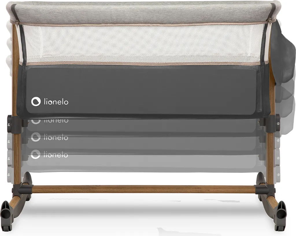 Kinderbett mit einer flexiblen Seitenwand kann als Zusatzbett und bei hochgezogener Wand als freistehendes Kinderbett eingesetzt werden. Luftiges Netz an beiden Seiten ermöglicht das Kind zu beobachten und sorgt außerdem für gute Luftzirkulation