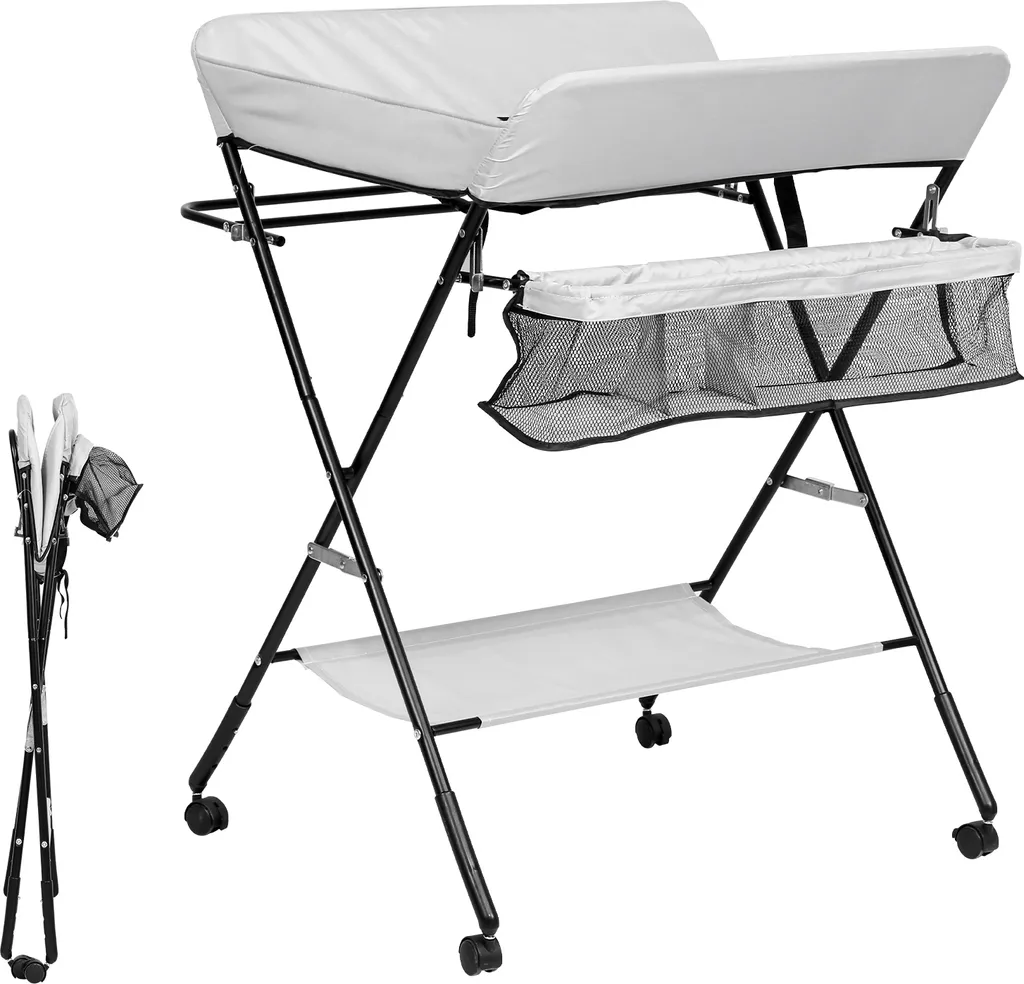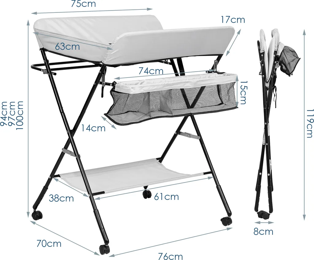 keinen Platz ein. Außerdem ist der Wickeltisch mit 4 feststellbaren Universal-Rädern ausgestattet, wodurch er einfach zu bewegen aber auch stabil zu halten ist.