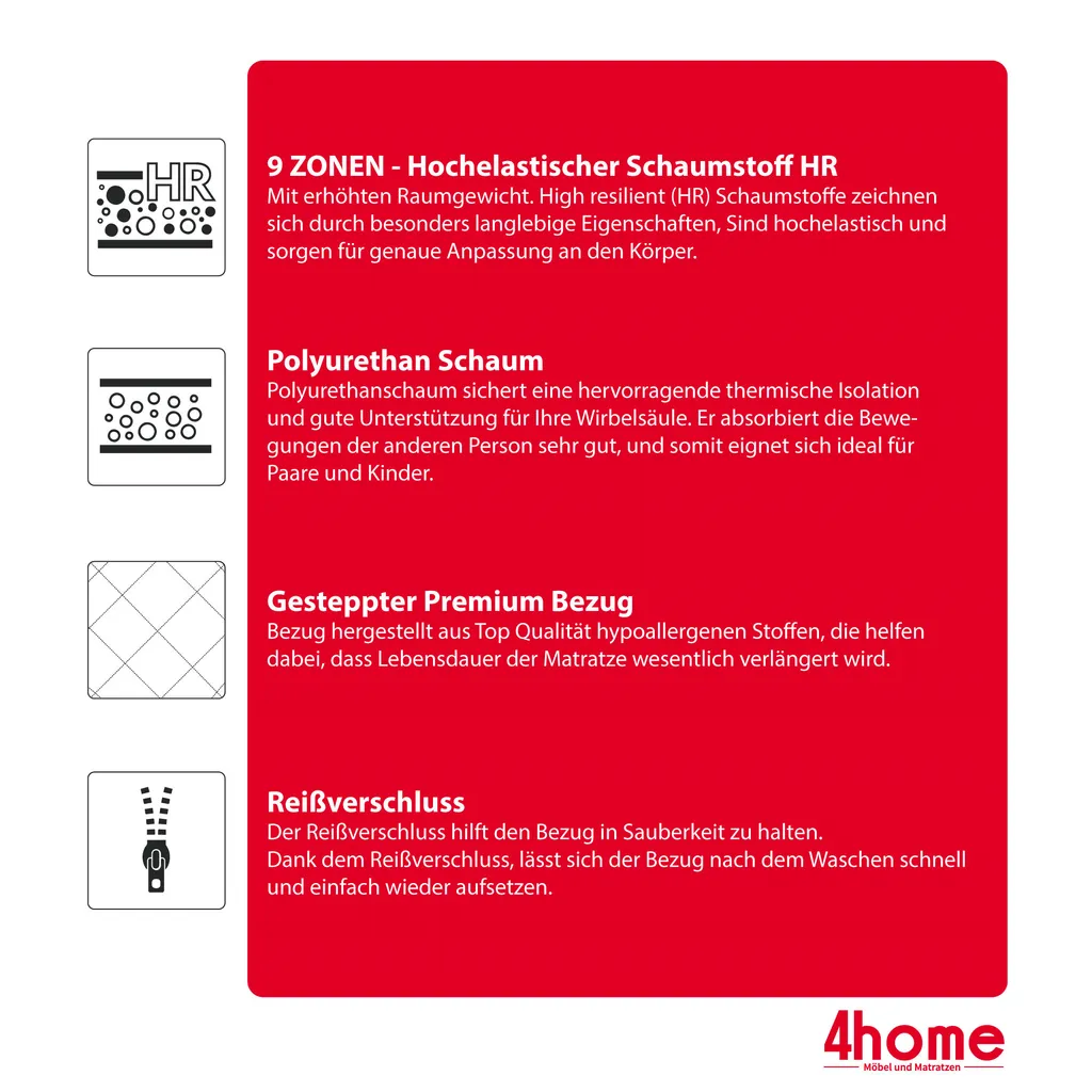 7 optimierte Liegezonen sorgen für eine perfekte Abstimmung auf den Körper und erhöhen den Liegekomfort enorm. Matratzenbezug abnehmbar und waschbar, strapazierfähiger und hautsympathischer Oberstoff mit atmungsaktiven Klimafasern versteppt.