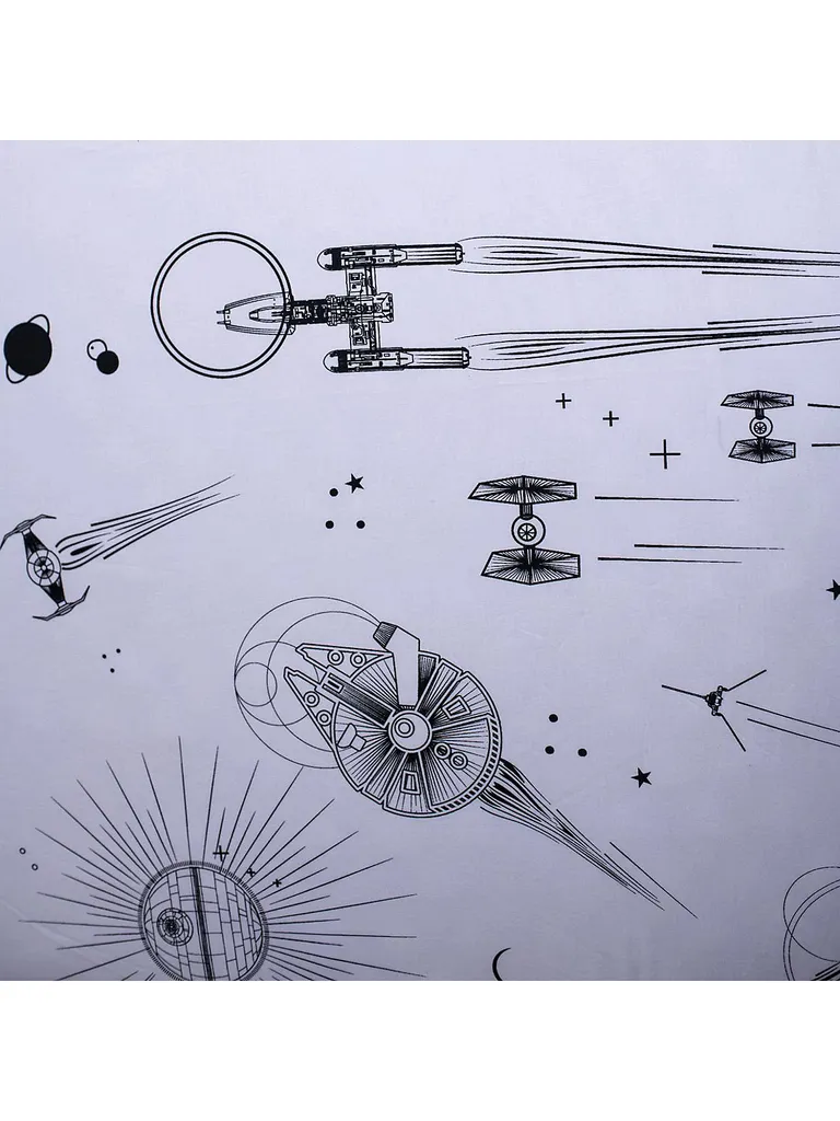 Auf dem Spannbettlaken sieht man die galaktischen Kriegsflotten aus den bekannten Star Wars Filmen auf weißem Hintergrund. Jedes dieser Kriegsflotten erinnern an die epischen Kämpfe um die Galaxie. Sei dabei und möge die Macht mit dir sein!