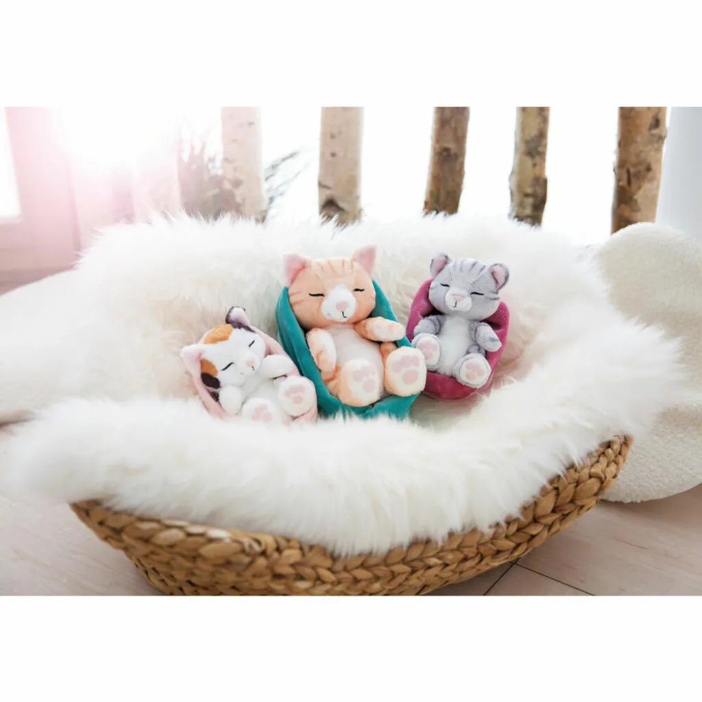 Die niedlichen kleinen Wonneproppen aus Plüsch sind in drei verschiedenen Farben und zwei Größen erhältlich. Sie schlafen eingekuschelt in ihren weichen Plüschkörbchen.