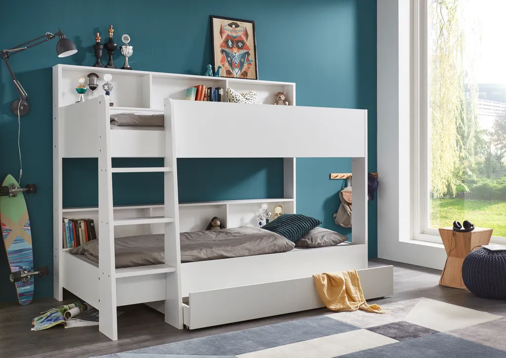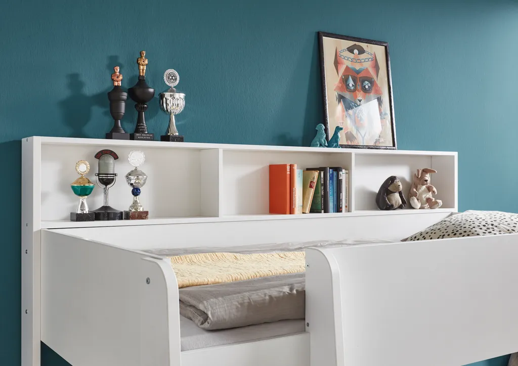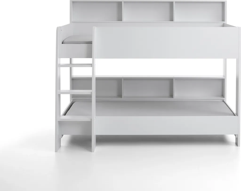 Tolles Etagenbett zum Schlafen und Spielen, mit 2 Schlafgelegenheiten übereinander. Besondere Funktionalität bieten die beiden Bücherregale an der Rückseite des Bettes. Sie bieten viel Platz und Ablagemöglichkeiten für Bücher oder andere dekorative Gegenstände. Die Fachinnenmaße der Regale sind jeweils ca. B: 66 x H: 27 x T: 16 cm. Das Bett ist aus Spanplatte mit einer pflegeleichen Oberfläche in AusführungNachbildung Weiß. Die Liegefläche ist jeweils 90 x 200 cm und die Leiter sowie Bodenplatten mit Lüftungslöchern sind im Lieferumfang enthalten. Die Lüftungslöcher dienen der Luftzirkulation für die Matratze. Die obere Liegefläche hat einen umlaufenden Absturzschutz und die max. Matratzenhöhe ist ca. 15. cm. Der Abstand zwischen den Liegeflächen beträgt ca. 63 cm. Vom Boden bis zur Oberkante des Absturzschutzes sind es 138 cm, bis zu Oberkante des Regals ca. 170 cm. Die Leiter ist links oder rechts montierbar. Breite Trittstufen sorgen für sicheres Hinauf- und Hinabsteigen. Die Bettpfosten sind aus 22 mm Spanplatte und geben dem Bett eine hervorragende Standfestigkeit. Das Bett ist hochwertig verarbeitet und zeichnet sich durch sehr gute Stabilität aus. Die Matratze, die Kissen und Dekomaterial gehören nicht zum Lieferumfang. Benötigte Stellfläche ca: B: 207 x H: 138/170 x T: 130 cm. Die Ware ist zerlegt mit Aufbauanleitung, zur einfachen Selbstmontage. Gebaut nach EN747 1+2: 2015.