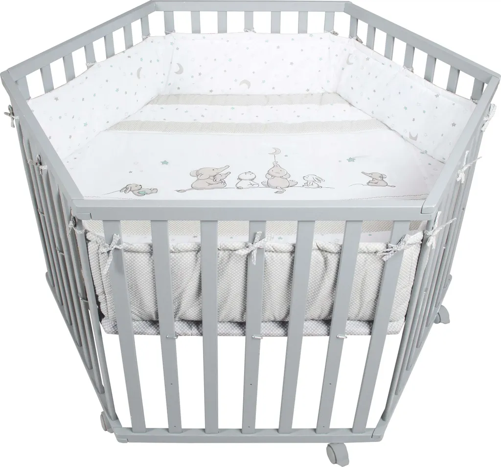- Das taupefarbene 6-eckige Laufgitter aus Holz ist mit kuscheliger Textileinlage und mit Flachstäben ausgestattet und bietet durch die gepolsterte Stoffeinlage als Nestchen besten Rundumschutz.