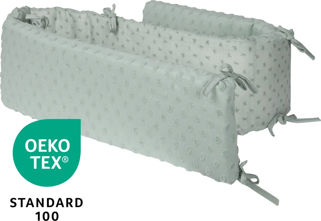 Das roba Nestchen ‚Lil Planet‘ sorgt mit seinem hautfreundlichen, wasseraufnehmenden und extraweichenBaumwoll-Stoff für ein kuscheliges und trockenes Gefühl im Babybett. Gerade Babys haben ein großes Kuschelbedürfnis und lieben es gemütlich, weich und warm. Das Babynest schenkt Ihrem Baby die nötige Nestwärme und sorgt für liebevolle Geborgenheit. Das Nestchen polstert die Gitterstäbe im Kopfbereich des Babybettchens ab und sorgt dafür, dass die kleinen Gliedmaßen Ihres Babys im Inneren des Bettchens bleiben. Mit diesem Nestchen ist Ihr kleiner Liebling zudem vor Zugluft geschützt. Die Produkte aus hochwertigem Garn sind hautfreundlich und überraschen mit einem extra weichen Touch und einer neuen Optik. Zur Produktion unsererBaby-Kollektion verwenden wir reinste, nachhaltige und unbehandelte Materialien. Die robaBaby-Produkte behalten auch nach vielen Wäschen ihre Form und ihre superweiche Haptik. Dank spezieller Oberflächenbehandlung und Vorwäsche bleiben dieBaby-Produkte superweich. Wir verwenden ausschließlich atmungsaktive Materialien um einer Überhitzung Ihres Babys vorzubeugen. Die roba Organic Textilserie umfasst Produkte aus Naturfasern wie Babydecken, Schlafsäcke, Bettwäsche, Bezüge für Wickelauflagen, Kapuzenhandtücher, Waschlappen sowie Windeln aus Musselin-Stoff. Die Bettumrandung ist bei 40° C waschbar, trocknergeeignet und lässt sich mit Stoffbändern am Babybett befestigen. Vorderseite: Musselin 100 % Baumwolle GOTS, Rückseite: Terry Dot 80 % Baumwolle GOTS, 20 % Polyester, Füllung: Wattierung 100 % Polyester. Passend für Babybetten 60 x 120 cm oder 70 x 140 cm. Das roba Nestchen ‚Lil Planet‘ ist 170 cm lang und 18 cm hoch. Passend für Babybetten 60 x 120 cm oder 70 x 140 cm. Farbe: frosty green.