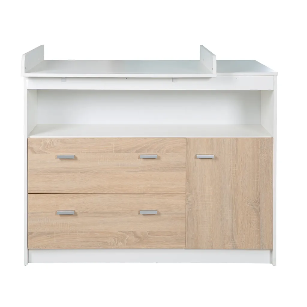 Die roba Wickelkommode „Gabriella“ bicolor, weiß / Eiche sägerau, mit abnehmbarem Wickelansatz macht mit ihrer rückenschonenden Wickelhöhe von 90 cm die Babypflege für Eltern und Baby zum Vergnügen. HxB: 98x117cm, Tiefe: mit/ohne Wickelansatz 75/39cm. Durch die geräumige und praktische Einteilung der breiten Kommode (1 Tür, 2 breite Schubladen, 1 großes offenes Fach) sind alle Wickelutensilien und Babysachen in greifbarer Nähe verstaut. Die breite Wickelkommode im klassischem Stil haben einen weißen Korpus und Fronten in einem weichen Eiche sägerau Ton. Die Kommode besteht aus melaminbeschichteter, strapazierfähiger Spanplatte. Die roba Wickelkommode mit Wickelansatz wächst von Geburt an mit. Für Ihr Kindergartenkind dient sie als erhöhter Sitzplatz, damit Sie in einer bequemen Stehposition mühelos beim Anziehen helfen können. Später lässt sie sich als Kommode im Jugend- oder Wohnzimmer verwenden. Die montagefreundliche Wickelkommode entspricht den aktuellen Sicherheitsstandards nach EN 12221 – 1+2:2008 + A1:2013. Alle verwendeten Materialien sind und aus nachhaltiger Forstwirtschaft. Mit weiteren Kindermöbeln der Serie „Gabriella“ lässt sich ein schönes Kinder- und Babyzimmer einrichten.