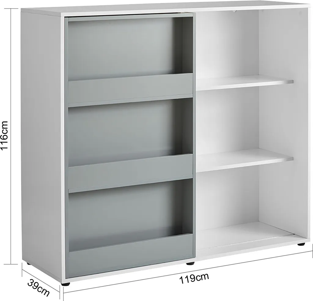 Mit drei breiten Einlegeböden im inneren und drei kleinen Staufächern außerhalb der Schiebetür, haben Sie reichlich Stauraum für Ihre Zeitschriften, Spielzeug, Büchern und anderen Gegenständen.