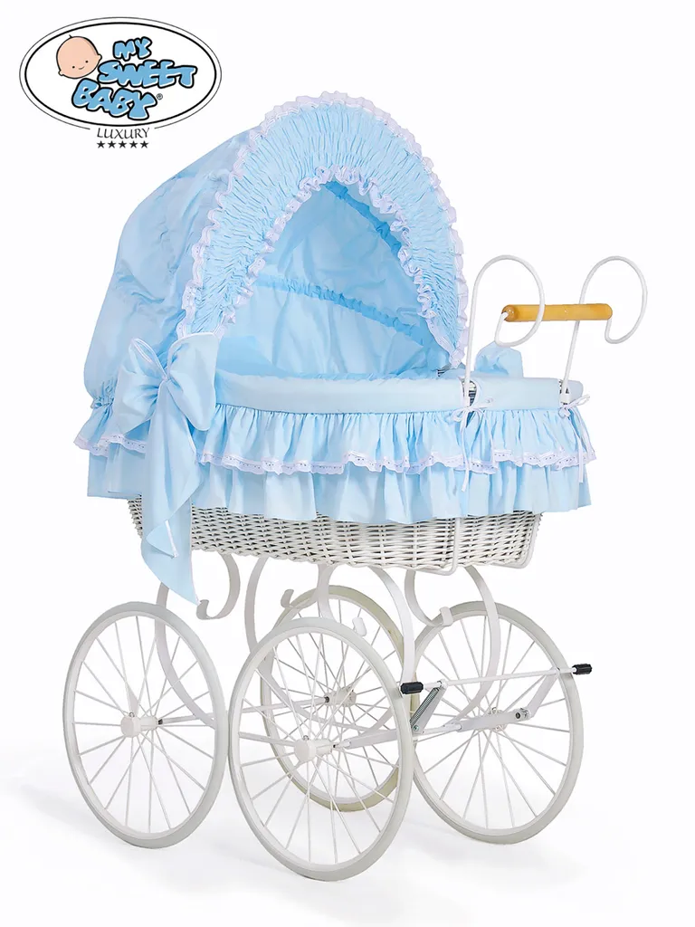 Stubenwagen mit Weidenkorb mit einem Handgebogenen Untergestell in Retrostyle. Den besondern Charakter unterstreichen die Metallräder. Speichen und der Griff mit Holz. Der Korb ist Handgeflochten. Die Haube kann zugeklappt werden. Bezug ist aus 100% Baumwolle genäht. Der Korbbezug ist mit einer Vliesschicht ausgestattet, was weich ist und die Geräuche dämpft.