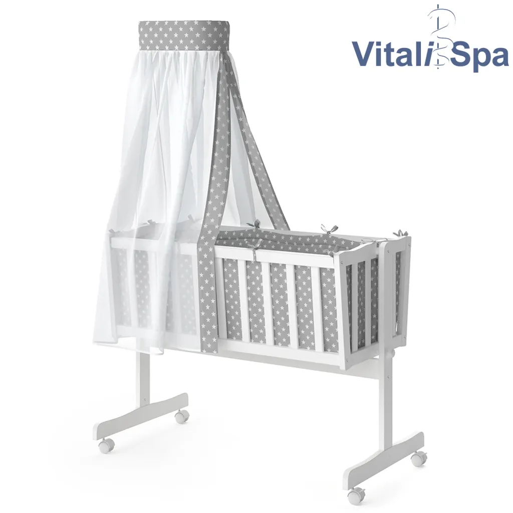 Im Inneren ist die Wiege durch ein weiches Nestchen gepolstert und es ist ein Bettwäscheset mit niedlichen Bezügen im Sternenmotiv enthalten.